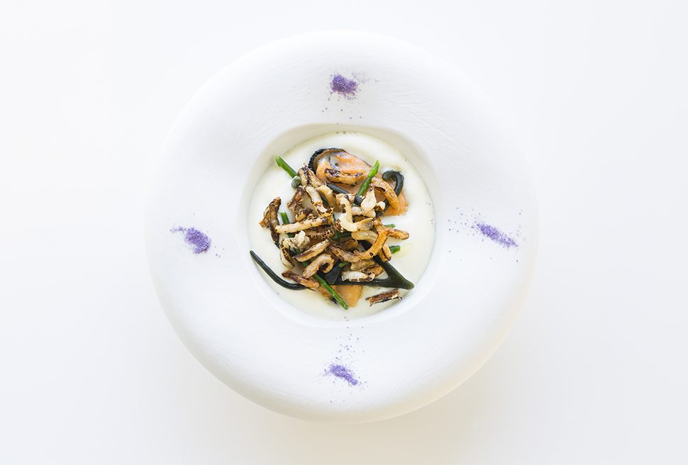 Disporre la spuma sul fondo del piatto, aggiungere le cozze Nieddittas leggermente scaldate con la propria acqua e finire il tutto con le alghe di mare e il riso soffiato.