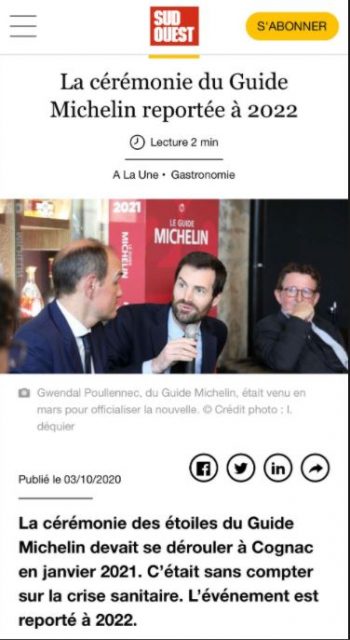 Incredibile ma fortemente ragionevole. Dopo 120 anni, per la prima volta salta la cerimonia (fisica) della guida Michelin Francia. La causa ovviamente è legata all’emergenza sanitaria. (Fonte: sudouest.fr). La cerimonia doveva tenersi nella cittadina di Cognac ed ora sarà probabilmente digitale come per tanti altri eventi. Erano già saltate le versioni fisiche delle cerimonie della guida Michelin in altri paesi. #michelinguide